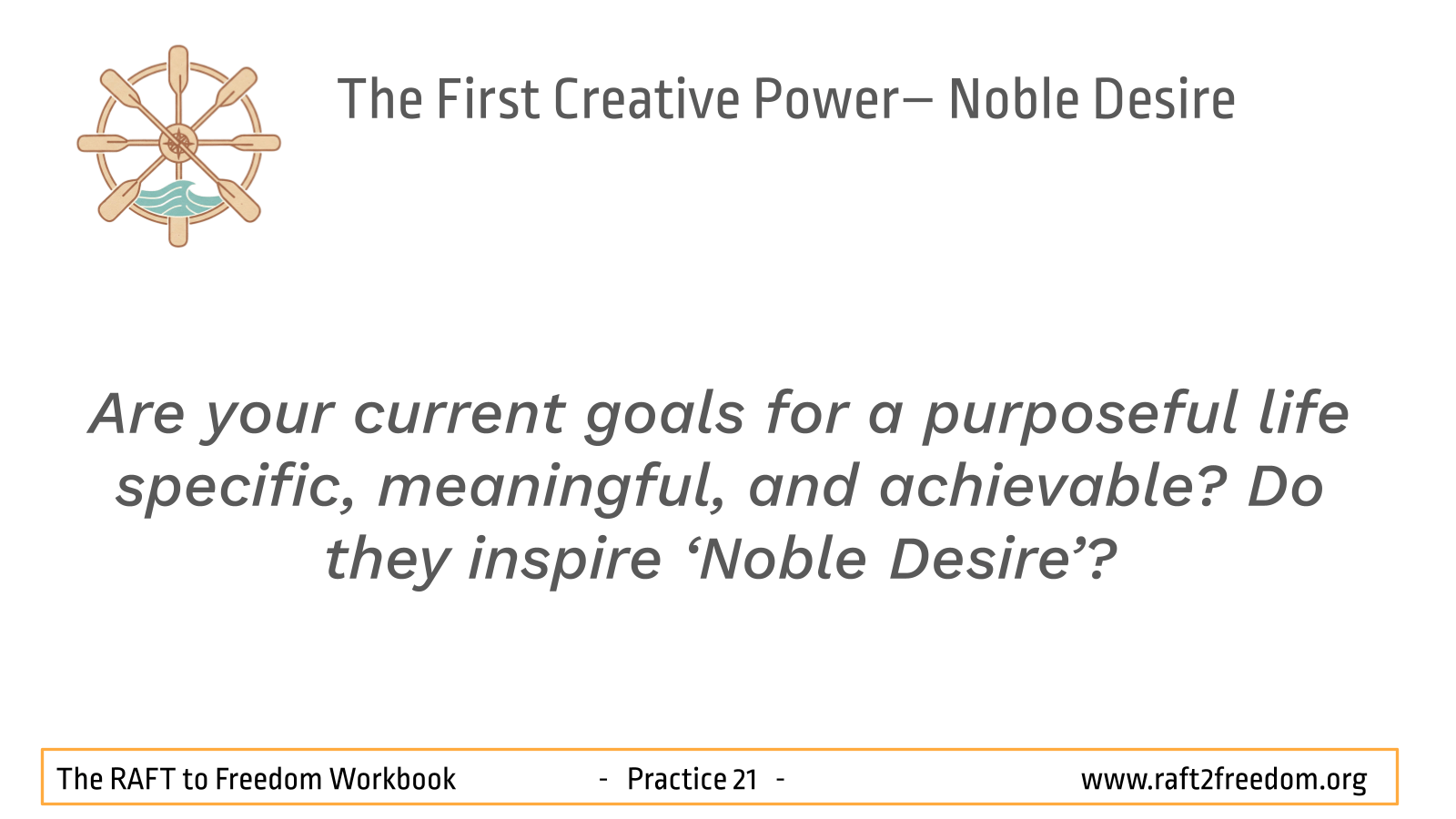 - Are your current goals for a purposeful life specific, meaningful, and achievable? Do they inspire ‘Noble Desire’?