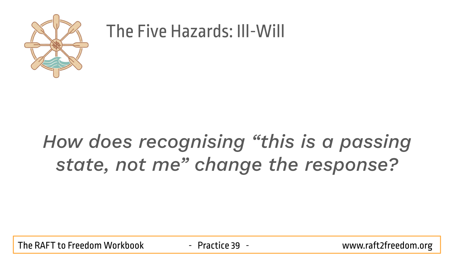 - Recognise and name it: Ill-Will has a distinct bodily signature (tightening jaw/chest, heat, narrowing of eyes). Gently label what is happening: “Ill-will is here.” This simple, non-judgemental naming loosens its hold.