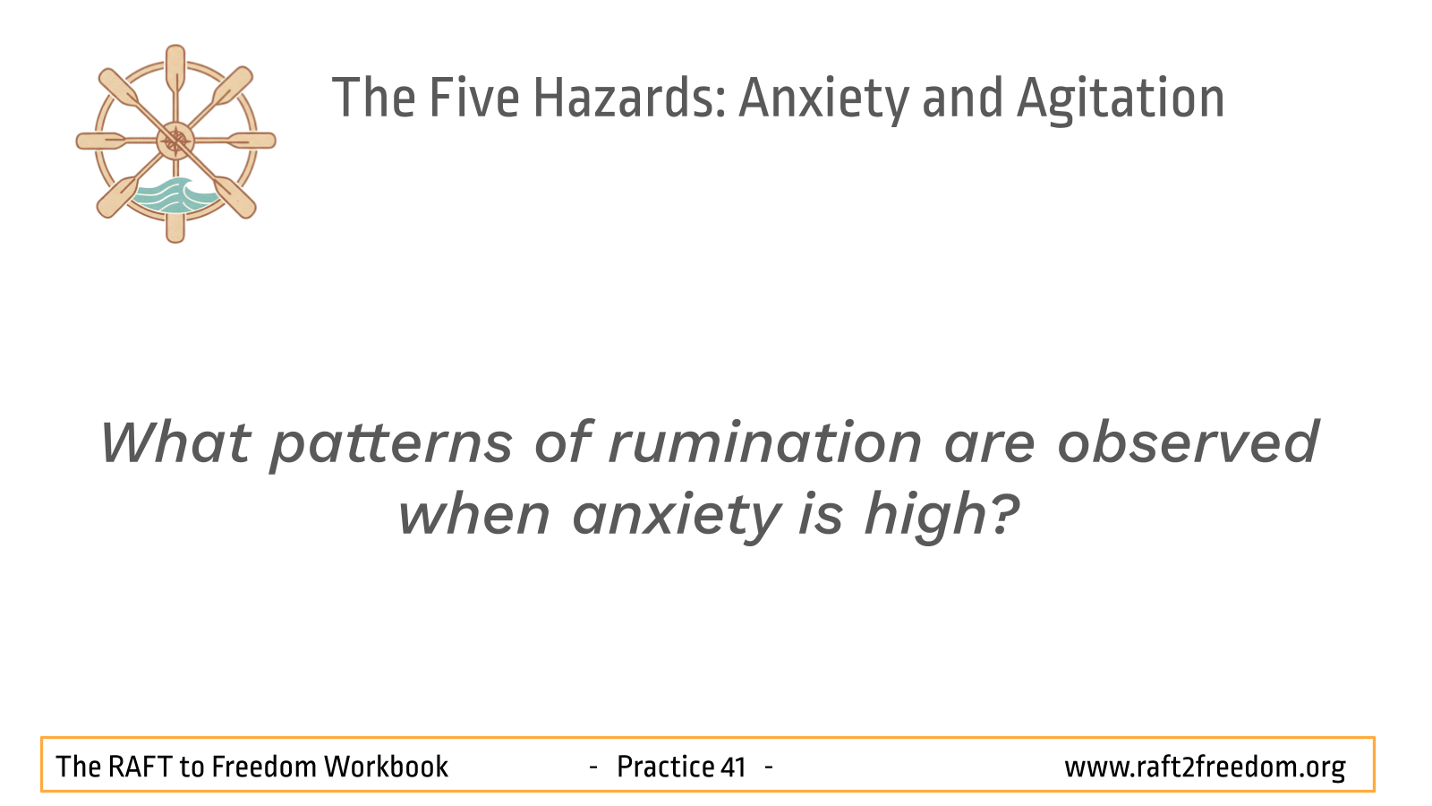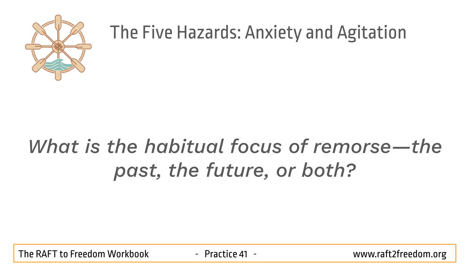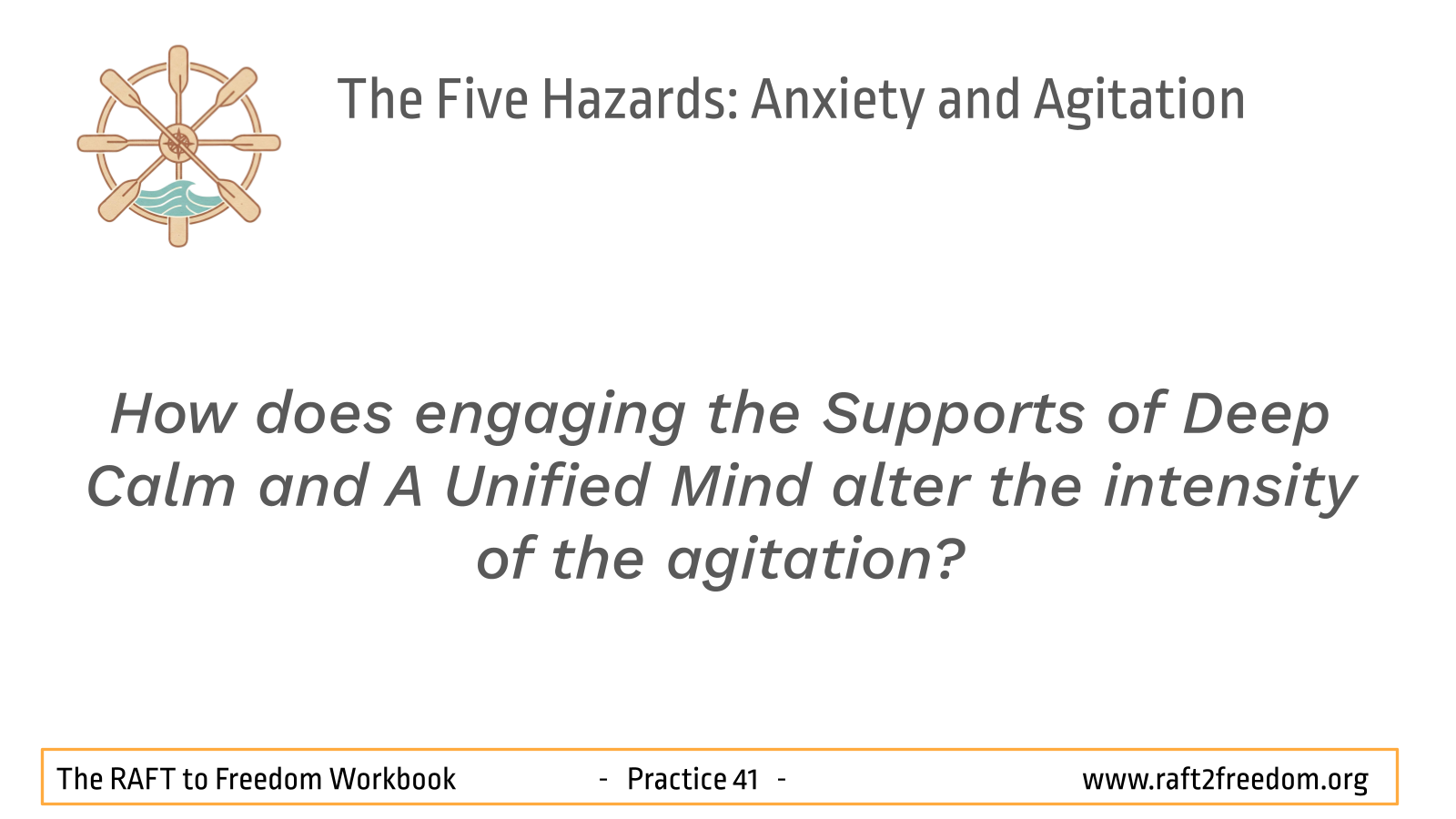 On our RAFT to Freedom chart, Anxiety and Agitation appear as the Hazard of the Choppy Waters of Restlessness and the Dragging Anchor of Remorse. Anxiety and Restlessness are the gusting winds pulling the mind toward imagined futures, while Agitation and Remorse is the heavy anchor of self-reproach, fixating on the past and preventing us from moving forward.