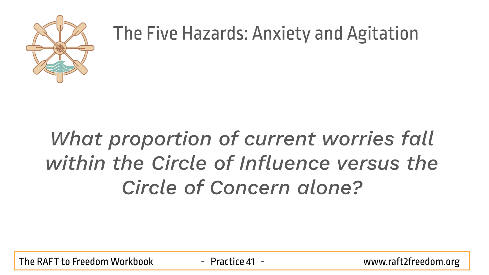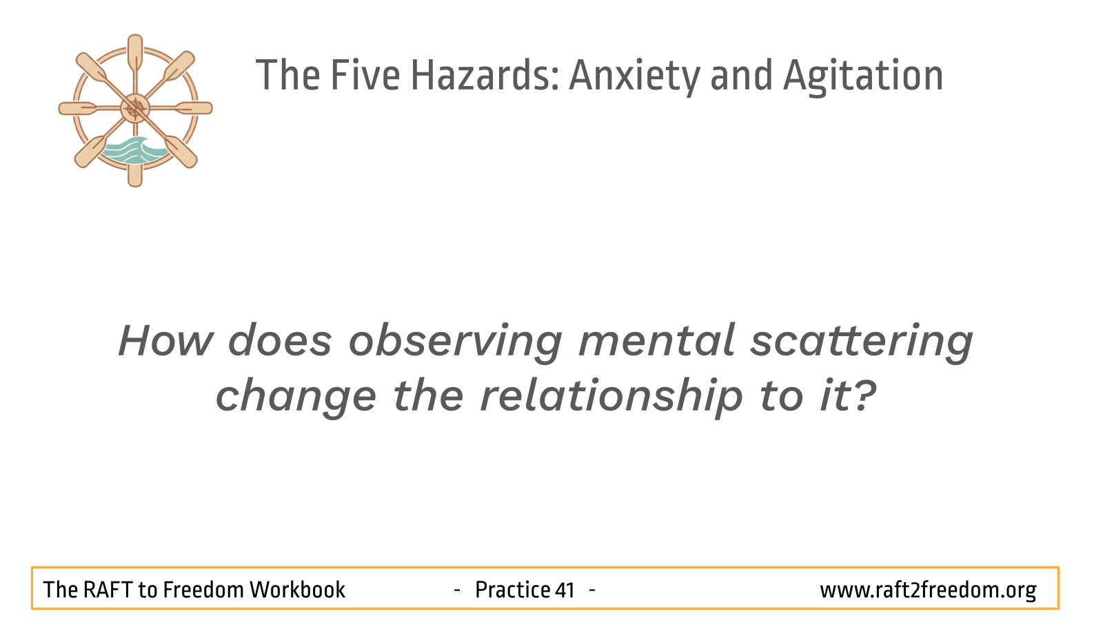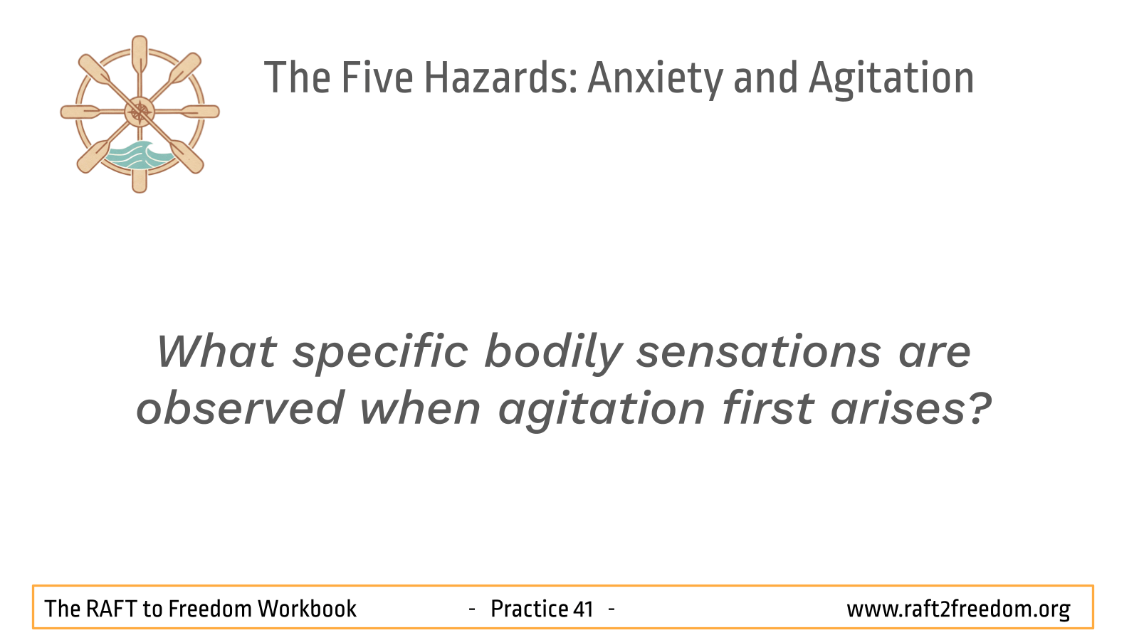 On our RAFT to Freedom chart, Anxiety and Agitation appear as the Hazard of the Choppy Waters of Restlessness and the Dragging Anchor of Remorse. Anxiety and Restlessness are the gusting winds pulling the mind toward imagined futures, while Agitation and Remorse is the heavy anchor of self-reproach, fixating on the past and preventing us from moving forward.