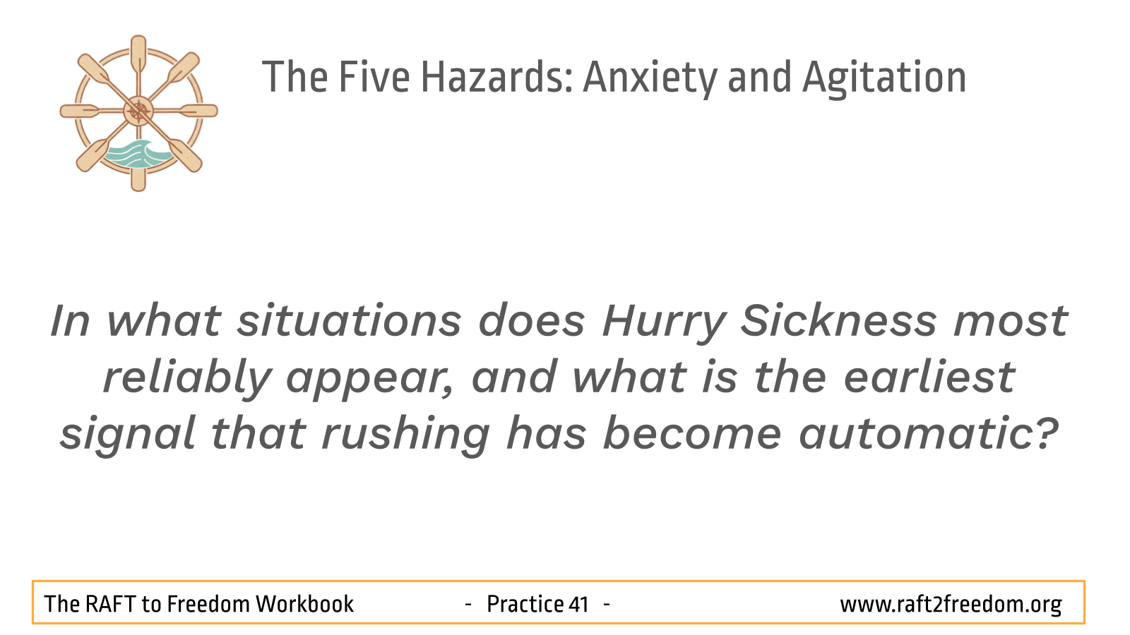 The fourth of the ‘Five Hazards’ is ‘Anxiety and Agitation’, traditionally known as Restlessness and Remorse. This hazard constitutes a surge into chaotic, high-arousal states that scatter our attention and unsettle the heart. It is two-fold: Anxiety is the forward-pulling restlessness often called the “monkey mind”, while Agitation is the backward-pulling, sticky fixation on past missteps, worry, or guilt. Within our RAFT to Freedom framework, this hazard arises from Delusion – a momentary misreading of what is happening, where thoughts feel solid and urgent, and the changing nature of experience is forgotten.