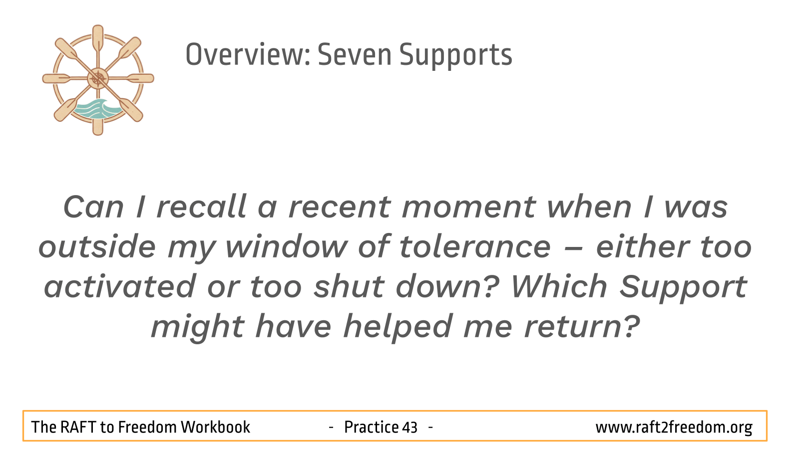 - Can I recall a recent moment when I was outside my window of tolerance – either too activated or too shut down? Which Support might have helped me return?
