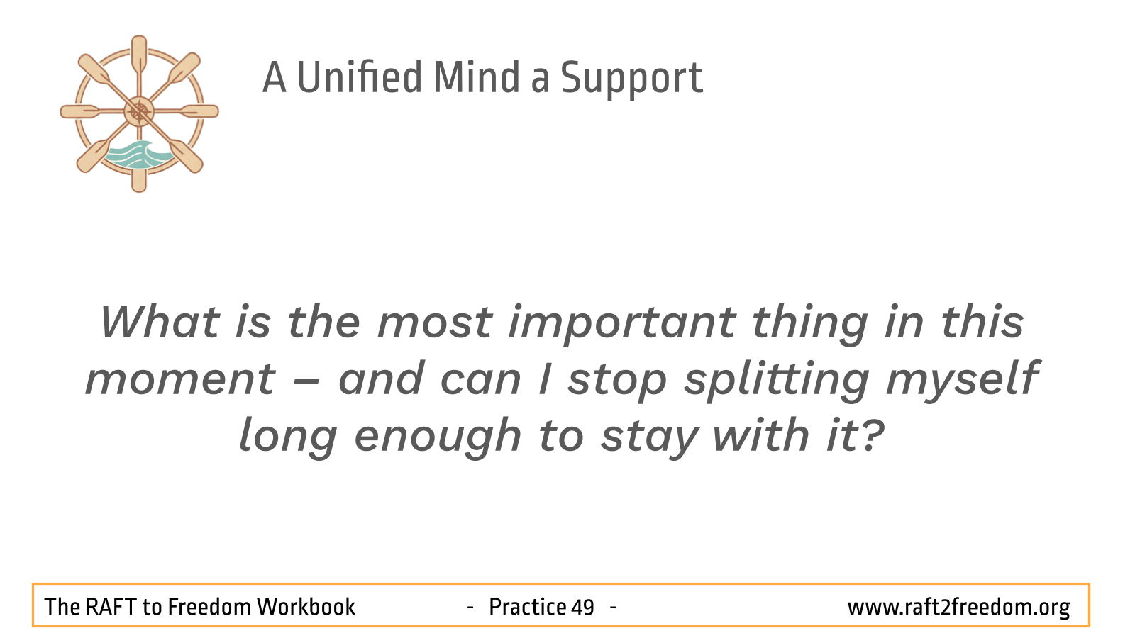 - What is the most important thing in this moment – and can I stop splitting myself long enough to stay with it?