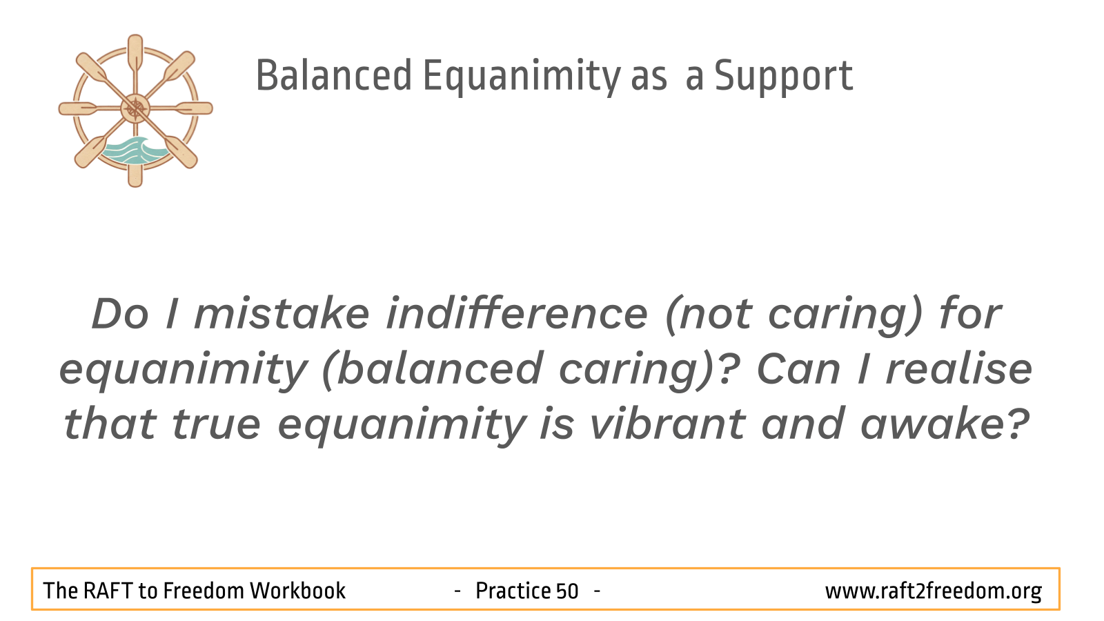 - Do I mistake indifference (not caring) for equanimity (balanced caring)? Can I realise that true equanimity is vibrant and awake?