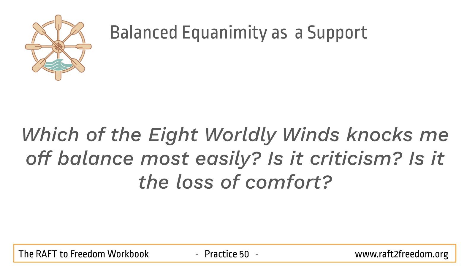 For a vessel without a keel, these winds are dangerous. We chase the winds of winning, approval, compliments and comfort and we fearfully capsize when hit by losing, rejection, criticism and discomfort. ‘Balancing Equanimity’ is the capacity to sail through all eight winds without capsizing. We feel the comfort, but we don’t chase it. We feel the discomfort, but we don’t drown in it. We remain even-keeled.