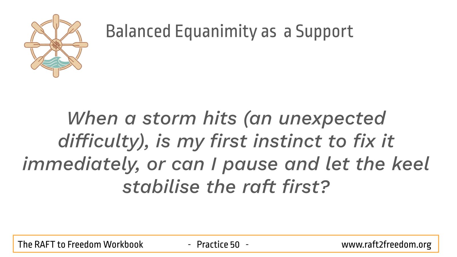 - When a storm hits (an unexpected difficulty), is my first instinct to fix it immediately, or can I pause and let the keel stabilise the raft first?
