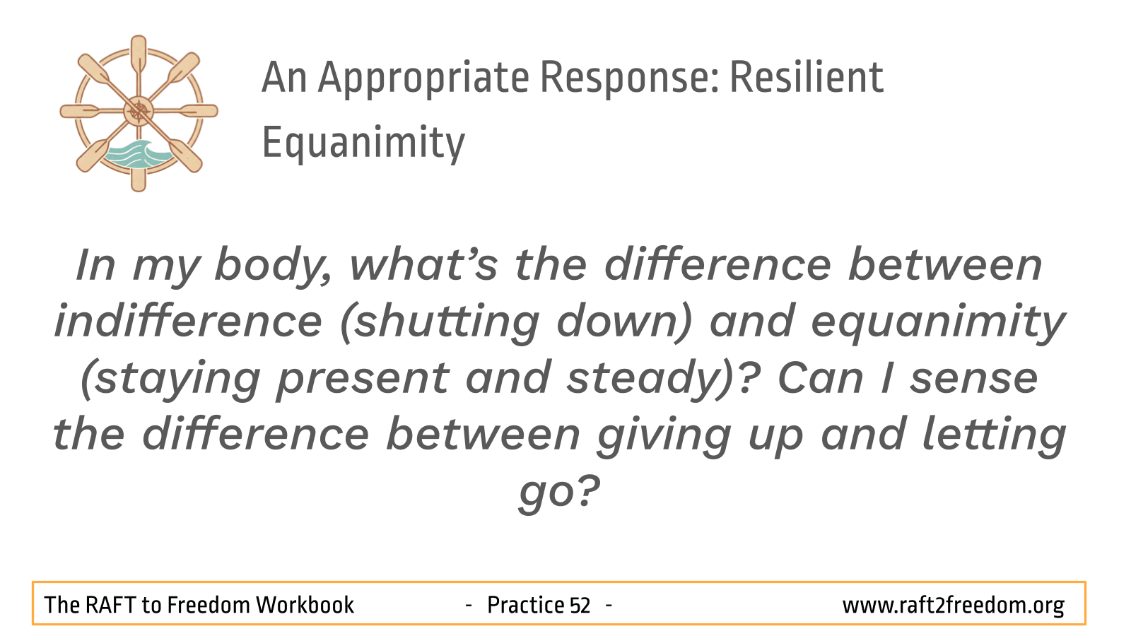 In RAFT terms, the far enemy is the Captain running around the deck screaming at the waves, trying to force the ocean to be flat. The near enemy is the Captain retreating below deck, locking themselves in the cabin, with arms folded, saying, “Whatever! I don’t care if we sink.” Indifference is cold and withdrawn. True equanimity stays on deck – warm, awake, and calm, meeting each change of weather without grabbing at it or pushing it away. ‘Resilient Equanimity’ is neither controlling nor cold. It is warm steadiness: you care, you stay present, and you don’t get hijacked.