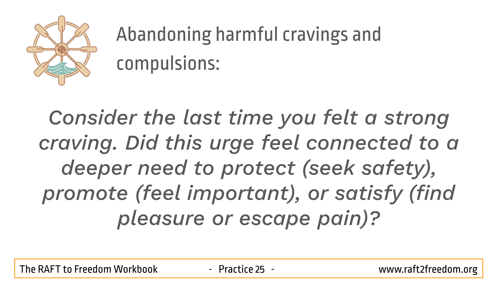 - Consider the last time you felt a strong craving. Did this urge feel connected to a deeper need to protect (seek safety), promote (feel important), or satisfy (find pleasure or escape pain)?