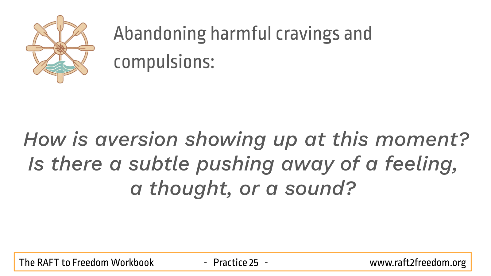 - How is aversion showing up at this moment? Is there a subtle pushing away of a feeling, a thought, or a sound?