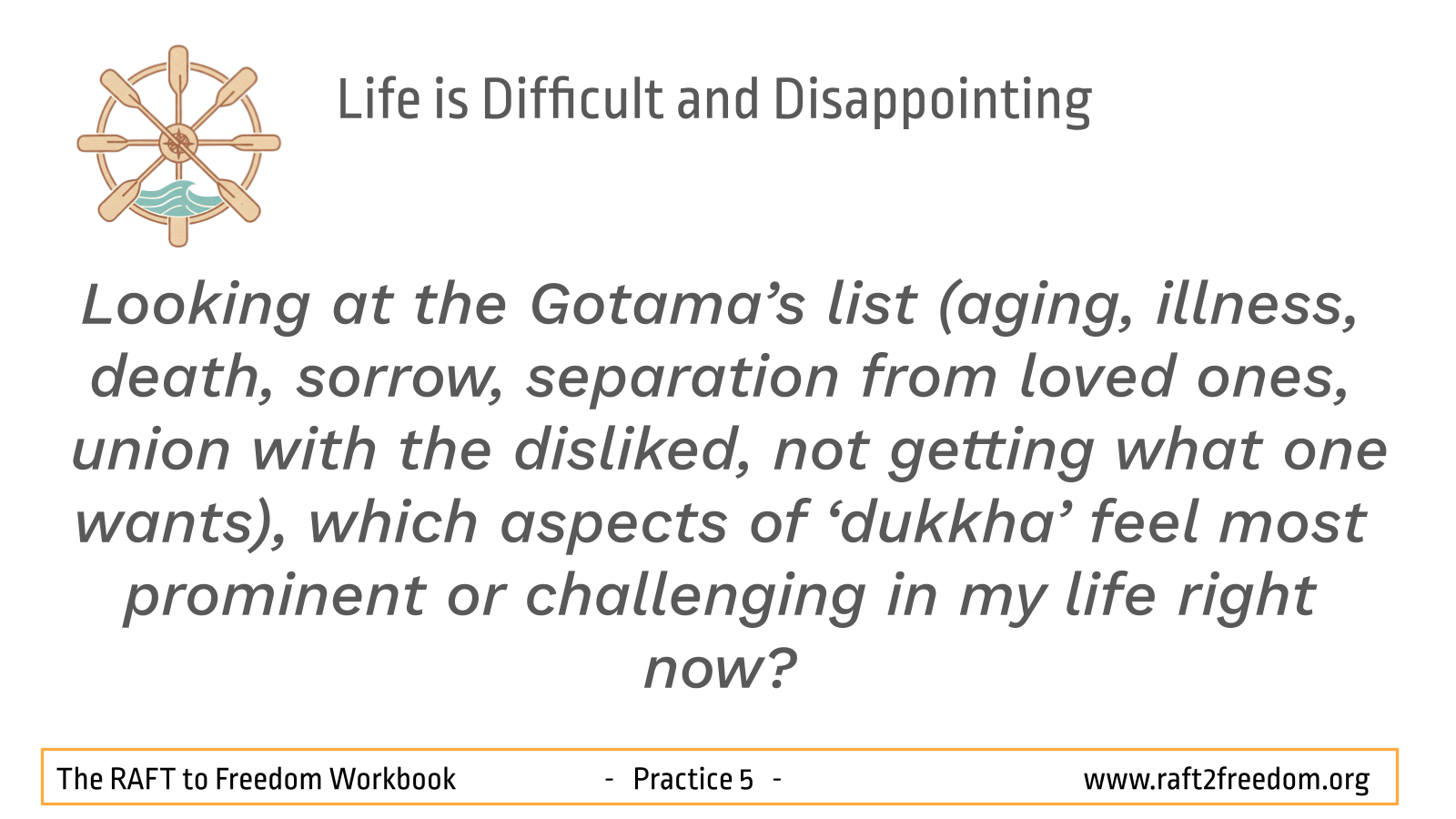 - Personal inventory of dukkha: Reflecting on Gotama’s list, write down specific examples from your own life for each category where possible (for example, an experience of physical pain, a significant loss, a time of intense frustration from not getting something, and so forth).