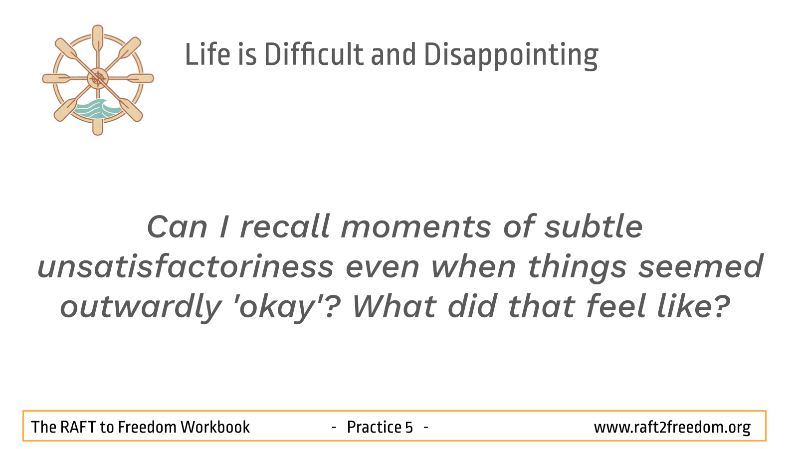 - Can I recall moments of subtle unsatisfactoriness even when things seemed outwardly ‘okay’? What did that feel like?