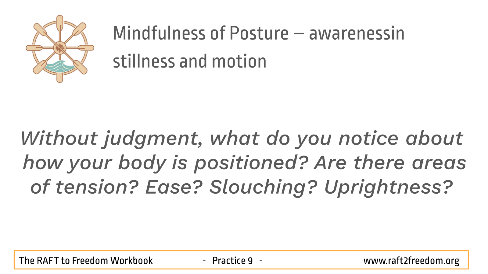 - Without judgment, what do you notice about how your body is positioned? Are there areas of tension? Ease? Slouching? Uprightness?