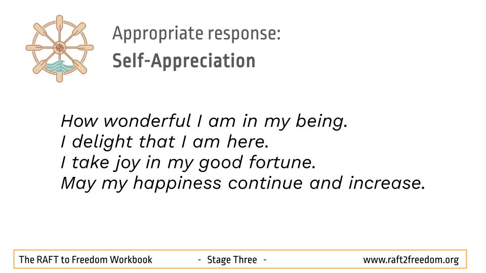 F | Freedom: Freedom from craving and compulsive patterns is possible. Gotama insisted that we can personally experience this liberation by actively cultivating moments of clarity, peace, and non–reactivity. Appropriate response – Self-Appreciation Phrases | ||||