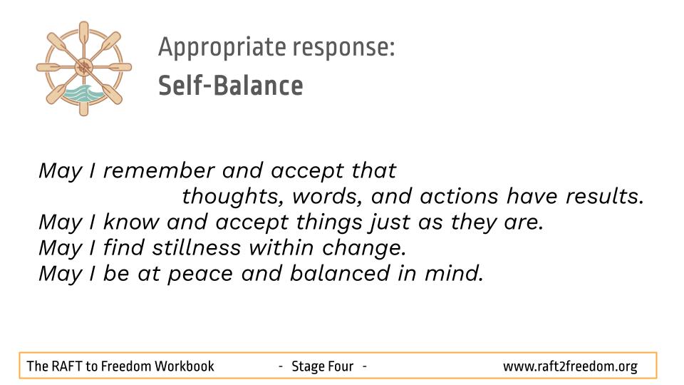 T | Train: Gotama provided a structured programme – the Noble Eightfold Path – that integrates wisdom, ethical conduct, and mental discipline into our daily lives. Through ongoing training, we develop resilience and equanimity, steering ourselves consistently towards freedom. Appropriate response – Self-Balance Phrases |