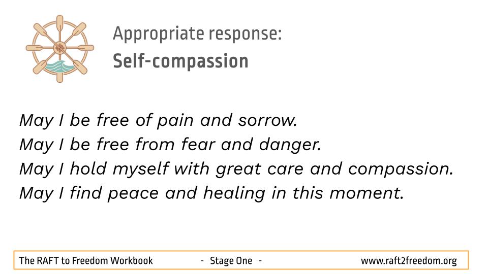 R | Recognise: Life is inherently painful, difficult, and disappointing. We often do not get what we want, yet frequently encounter what we don’t want. Gotama encouraged us to clearly see and deeply understand this reality. Appropriate response – Self-Compassion Phrases | ||||