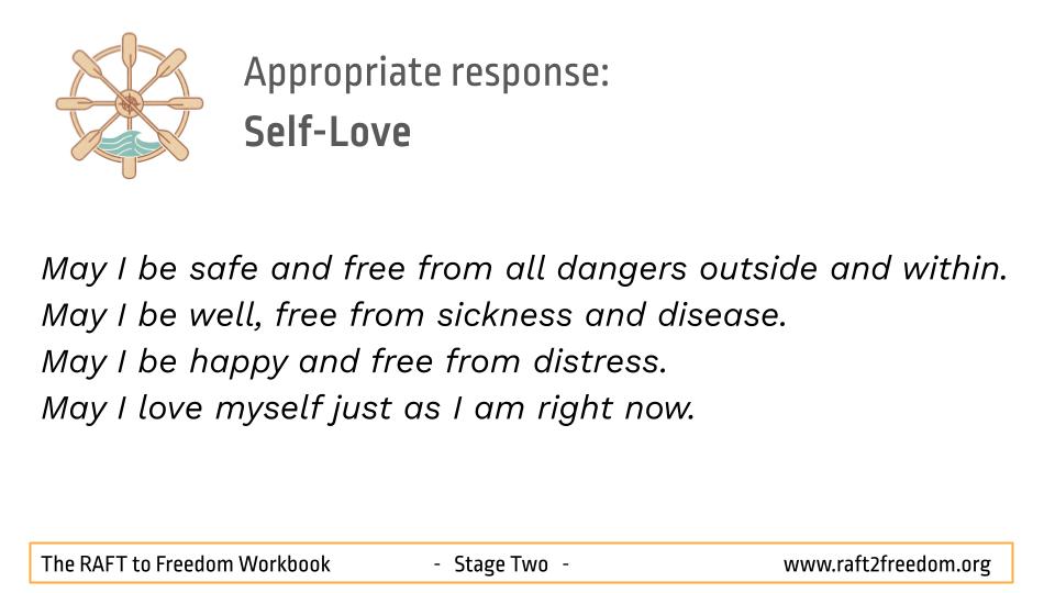 A | Abandon: Much of our pain, difficulty and disappointment stems from habitual cravings, compulsions, aversions, and preferences. Gotama urged us to abandon these destructive inclinations – not through force or suppression, but through compassionate understanding and skilful letting go. Appropriate response – Self-Love Phrases | ||||